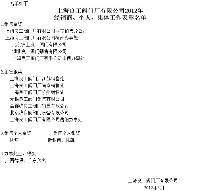 本次會(huì)議就2011年的工作和2012年的發(fā)展和目標(biāo),由總經(jīng)理郭瑋明作了重點(diǎn)講話,有關(guān)領(lǐng)導(dǎo)也就各人的工作作了發(fā)言。林金鏢董事長(zhǎng)也作了重要講話,上海良工閥門(mén)廠近年來(lái)經(jīng)濟(jì)運(yùn)行是快速發(fā)展的景象,2011年度的實(shí)現(xiàn)銷(xiāo)售指標(biāo)比2010年的遞增了50%,達(dá)到了歷史最好水平。這一成績(jī)的實(shí)現(xiàn),是與公司上下一致團(tuán)結(jié)努力分不開(kāi)的,是與全國(guó)銷(xiāo)售代理商的努力分不開(kāi)的。3月17日下午會(huì)議分三大塊進(jìn)行了深入的討論,就大會(huì)的要求和相關(guān)文件、政策,以及新一年的目標(biāo)和打算,分組會(huì)議討論熱烈、歡暢,紛紛表示堅(jiān)決擁護(hù)公司的發(fā)展政策,做好自己的本職工作,要再接再厲完成好公司2012年度的方針、目標(biāo)。各駐外銷(xiāo)售代理商也感謝上海良工在新的年度銷(xiāo)售政策上給予的支持,紛紛積極主動(dòng)簽訂了2012年度的銷(xiāo)售協(xié)議,爭(zhēng)取更好、更多地完成銷(xiāo)售任務(wù),將上海良工的“工”字牌商標(biāo)閥門(mén)產(chǎn)品進(jìn)一步做大做強(qiáng),認(rèn)真地服務(wù)于全國(guó)的客戶(hù)群,使上海良工的“工”字牌著名商標(biāo)閥門(mén)產(chǎn)品永遠(yuǎn)走在行業(yè)的前列,為國(guó)家各行各業(yè)的發(fā)展貢獻(xiàn)自己的力量。會(huì)議經(jīng)過(guò)三天的學(xué)習(xí)、討論、簽約,完成了各項(xiàng)議程,于3月18日?qǐng)A滿結(jié)束,并對(duì)榮獲金牌、銀牌的代理商和公司本部營(yíng)銷(xiāo)人員進(jìn)行了表彰、授牌。